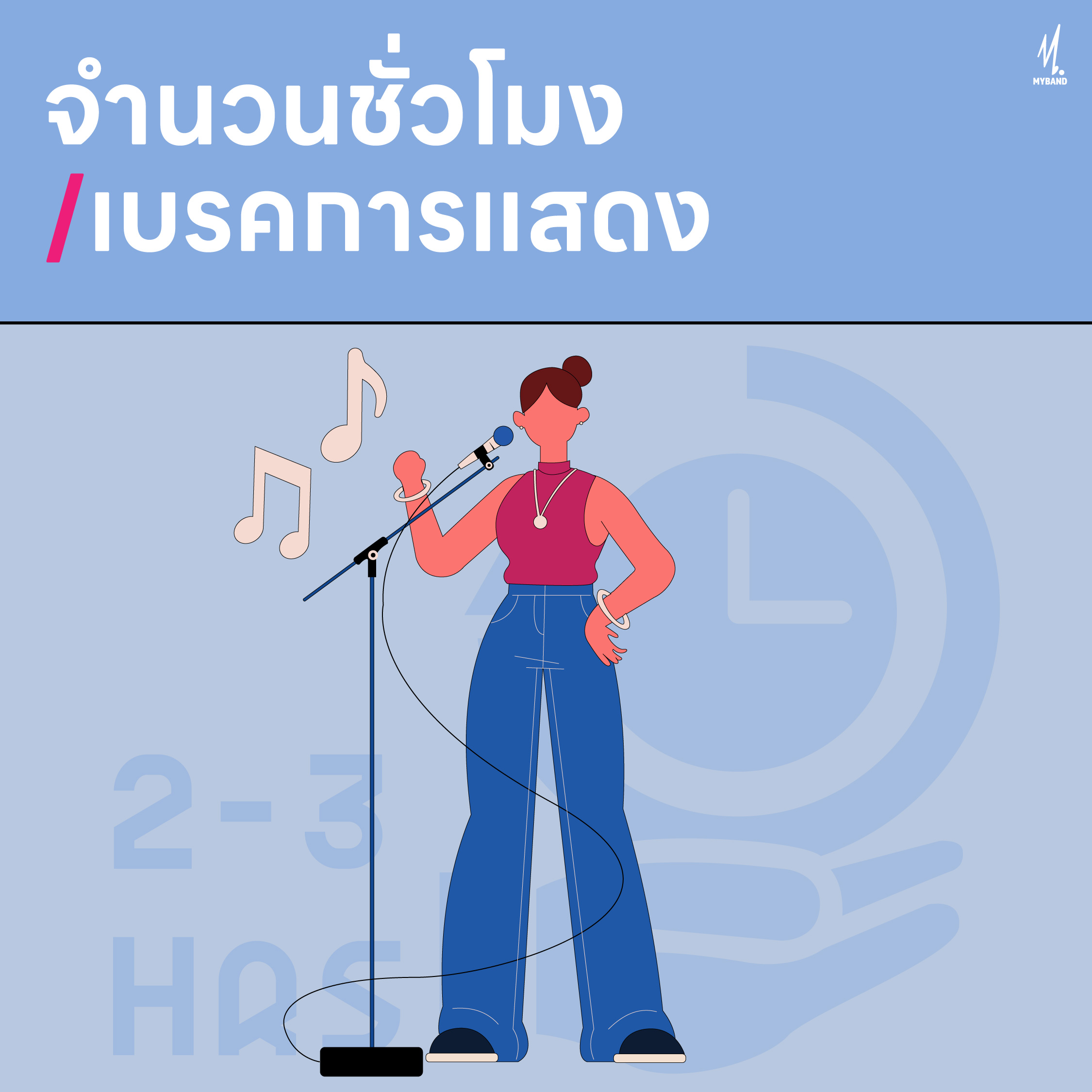 - โดยทั่วไป วงดนตรีจะคิดราคาสำหรับการแสดงประมาณ 2-3 ชั่วโมง (หรือ 2-3 เบรค) หากต้องการเวลาเพิ่ม จะมีค่าใช้จ่ายเพิ่มเติม