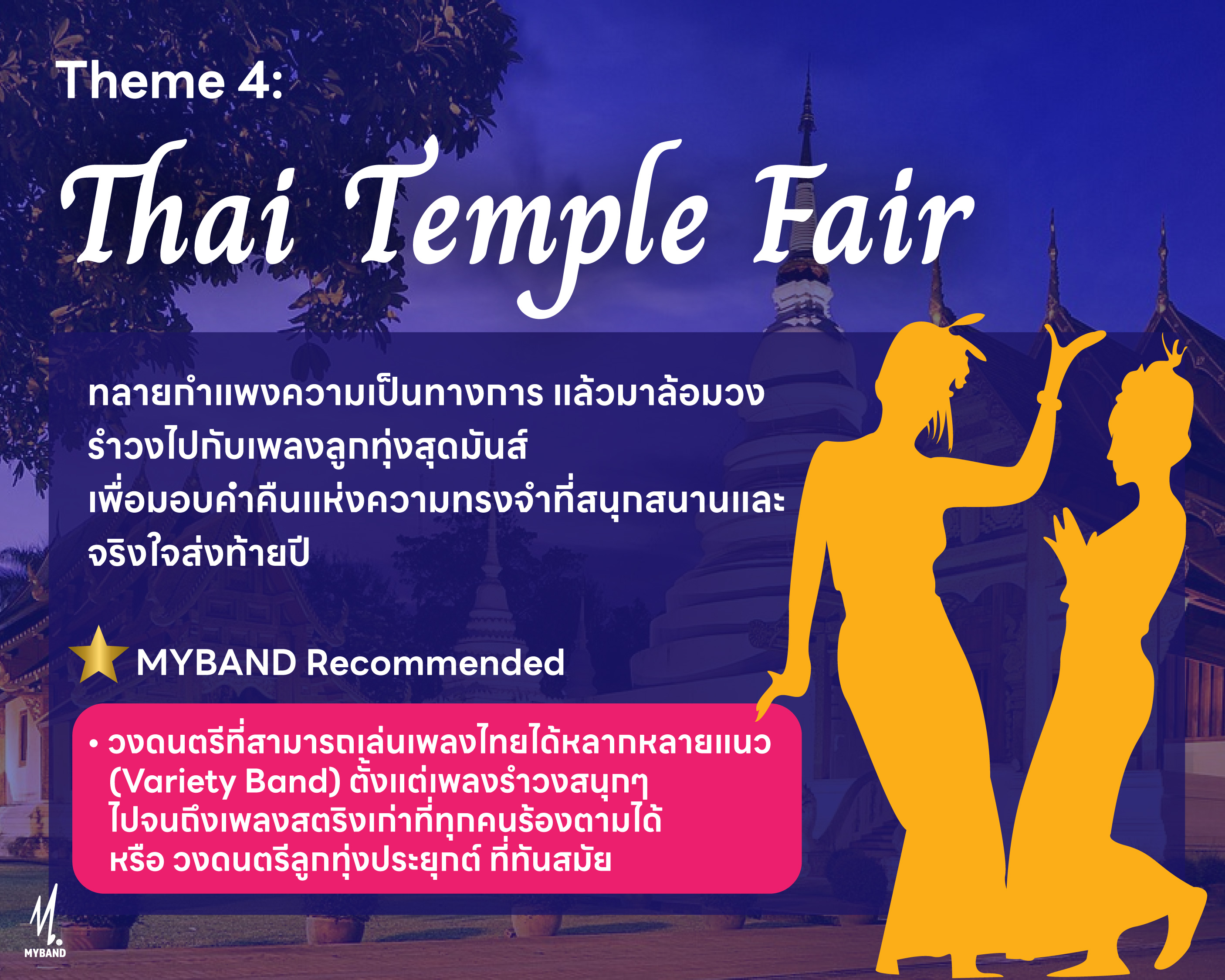 หัวใจสำคัญที่เชื่อมทุกธีมเข้าด้วยกันคือ "ดนตรี" ที่ใช่ ไม่ว่าคุณจะเลือกปาร์ตี้สุดหรูหรือสนุกสุดเหวี่ยง MYBAND ได้รวบรวมศิลปิน วงดนตรี และดีเจคุณภาพที่พร้อมจะตอบโจทย์ทุกจินตนาการของคุณ